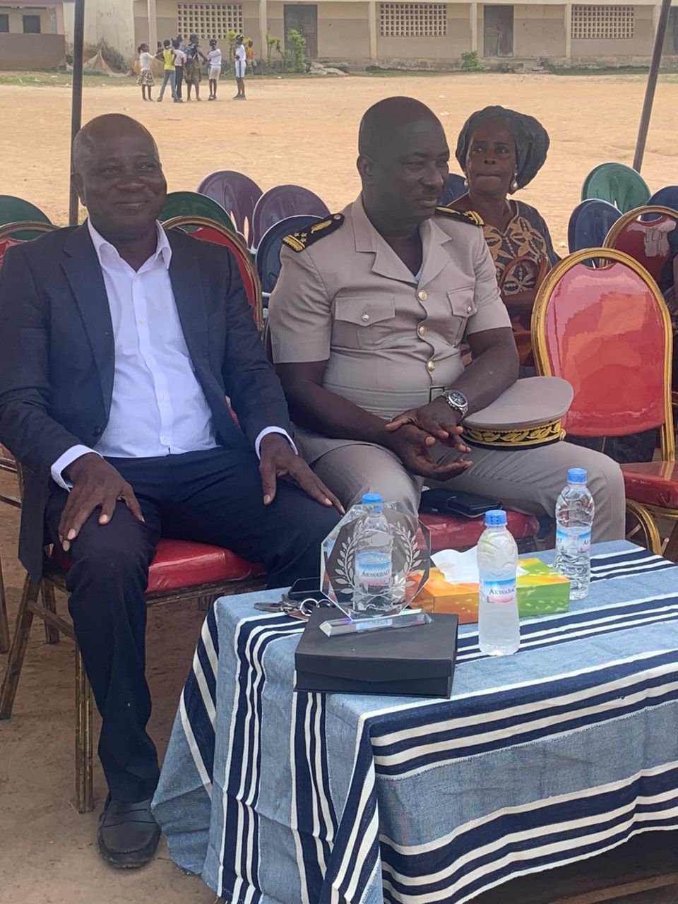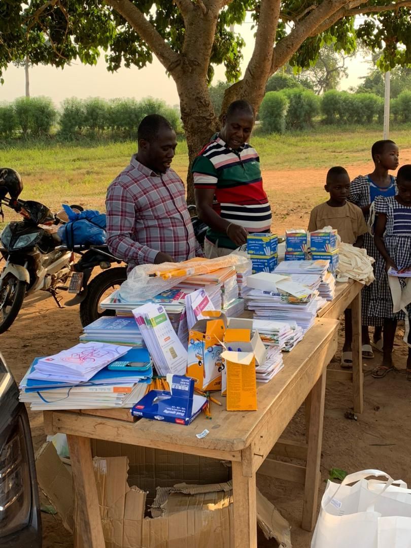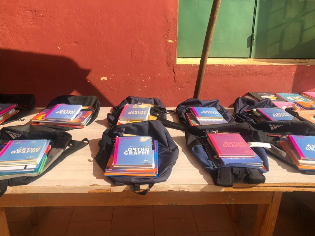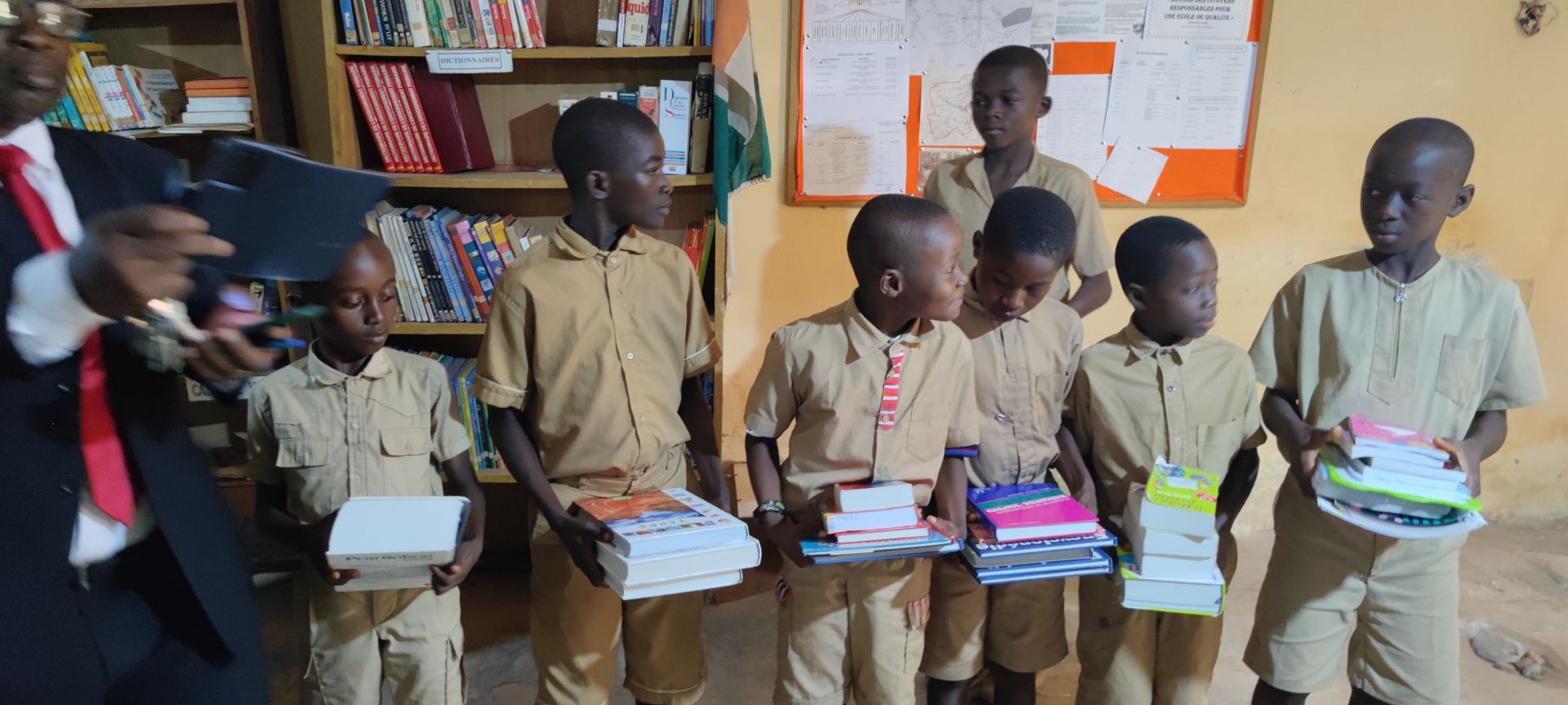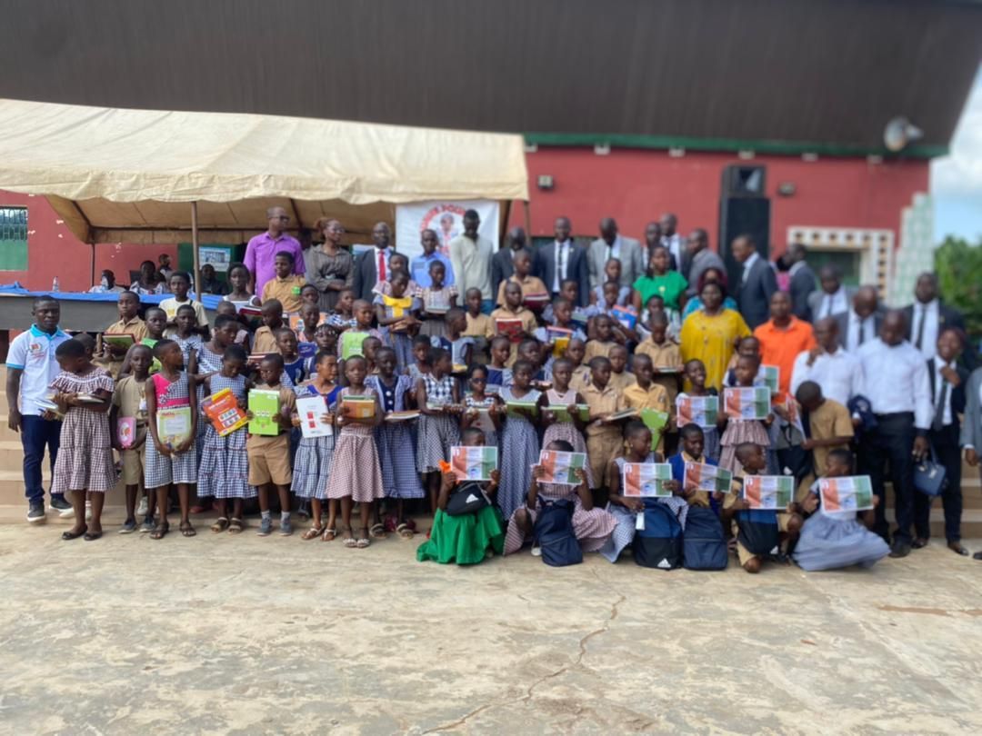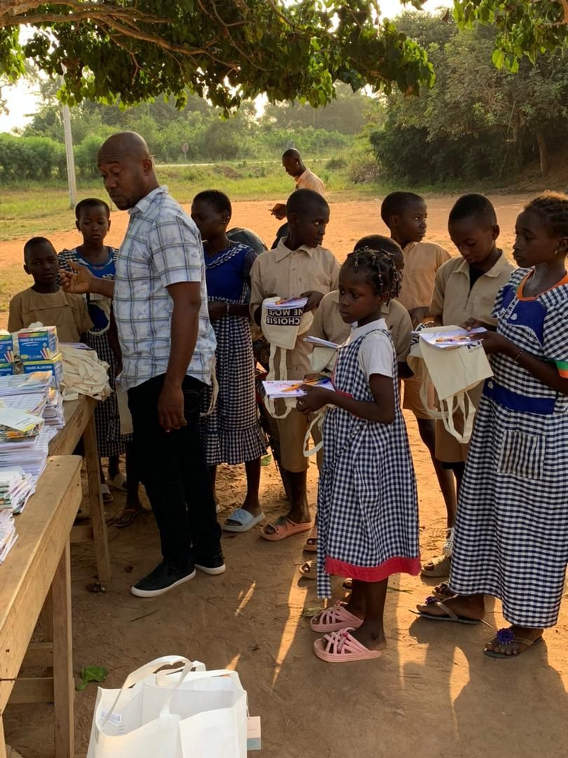 Distribution de manuels et fournitures scolaires, dans une école située à quelque kilomètre de Sinfra en Côte d'Ivoire.